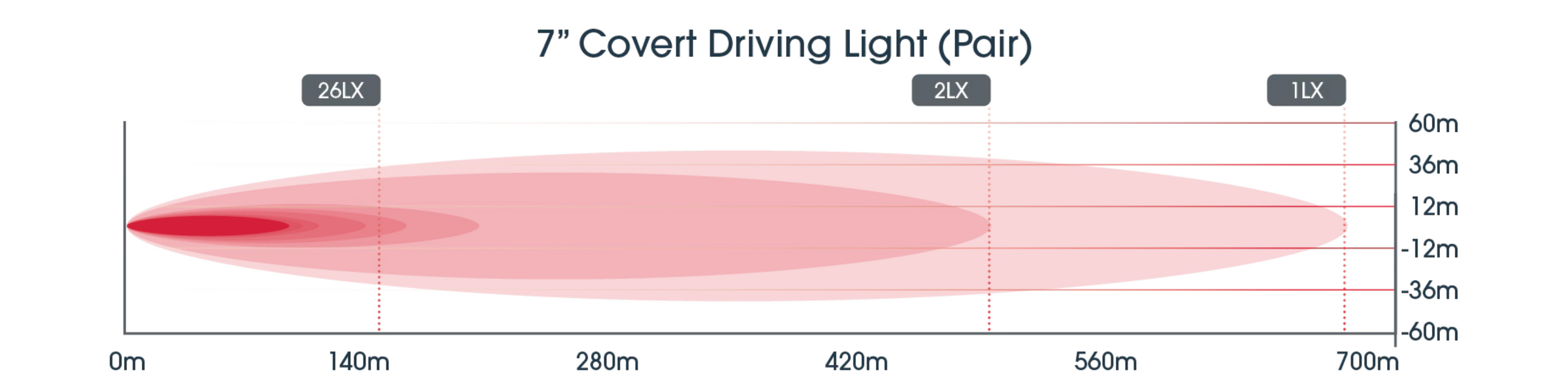 The Covert 7-Inch LED Driving Lights have an impressive light output, reaching 1 LUX at a distance of 700 meters. This makes them perfect for providing long-range visibility, especially during night-time or low-light conditions in off-road environments.