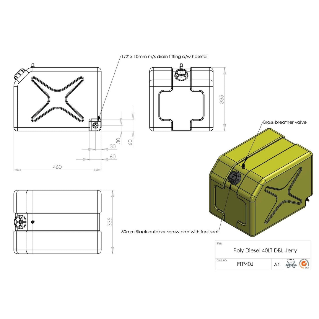 - Double jerry can shape and size - Use as stand-alone tank or built in - Supplied with screw filler cap - Brass vent and brass outlet for 10mm hose. - Dimensions (mm): 460(L) x 335(W) x 335(H)