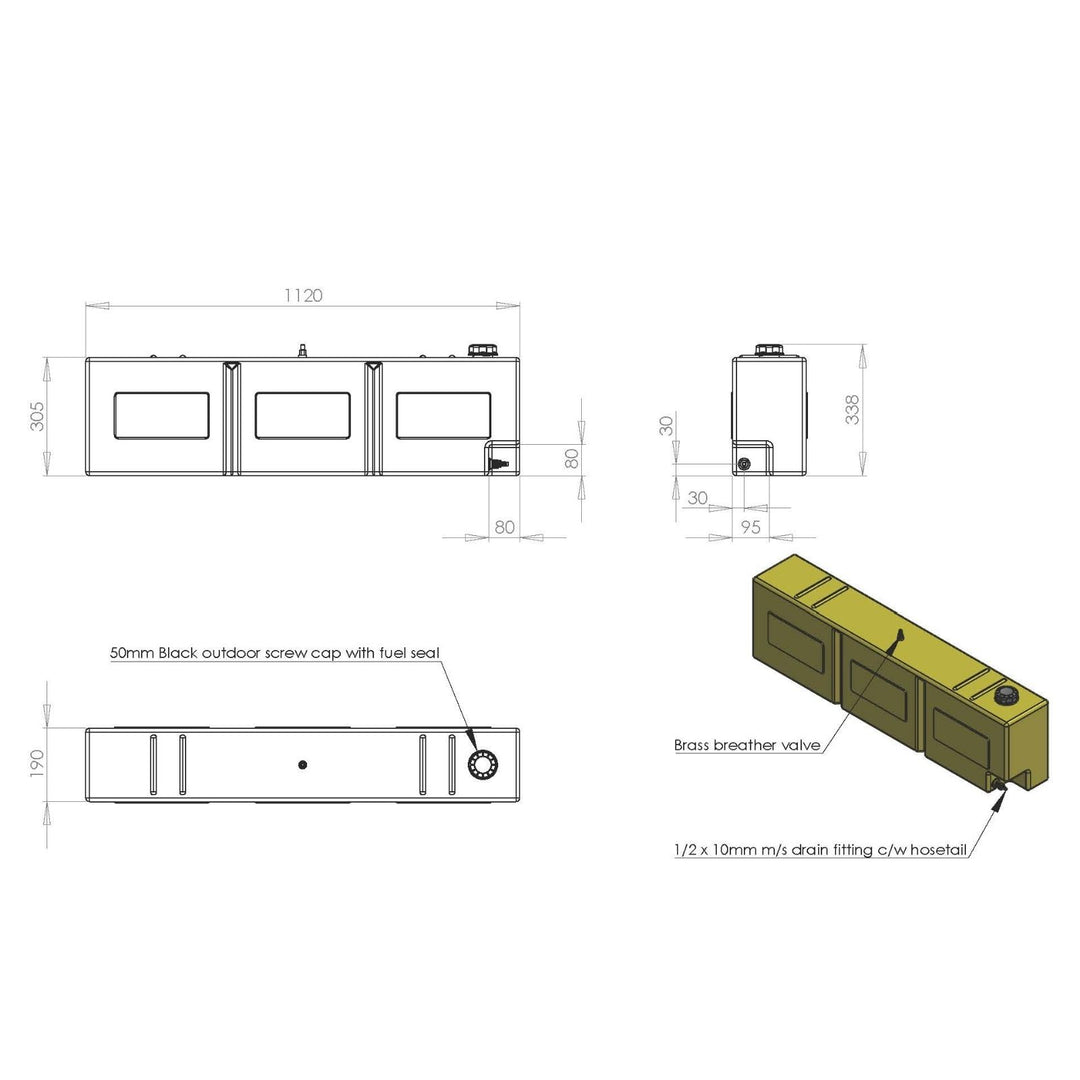 - For use in ute trays, built-in and other applications - Pump or gravity feed - Supplied with screw cap filler - Brass vent and brass outlet for 10mm hose - Dimensions (mm): 1120(L) x 190(W) x 305(H) - Total Weight: 6Kg