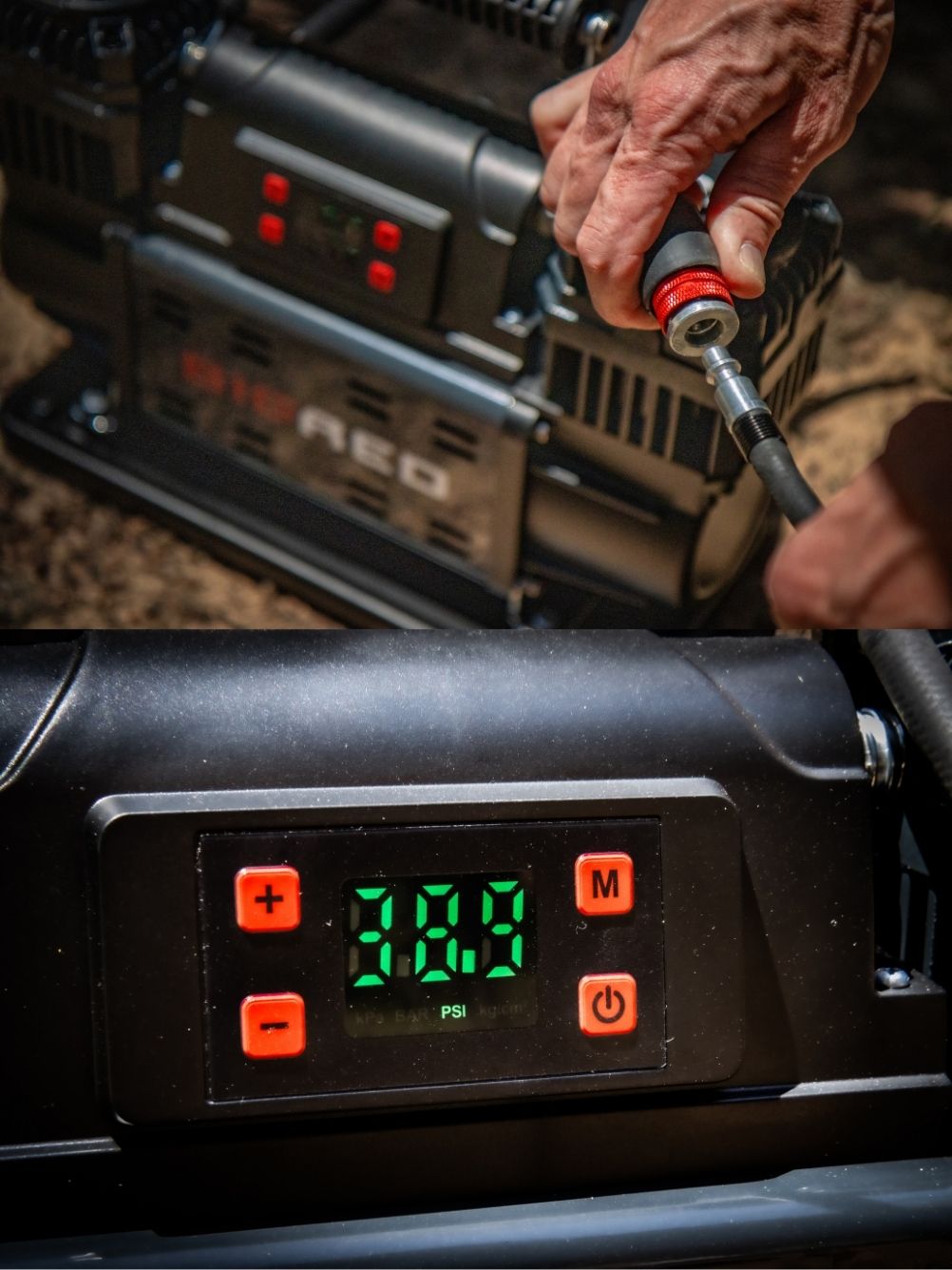 The Big Red Gear Air Compressor is compatible with multi-tyre inflation systems. We recommend use with the Big Red Gear 4xTyre Digital Air Hose Kit (BR8302) for ultra quick inflation of large 4WD tyres.